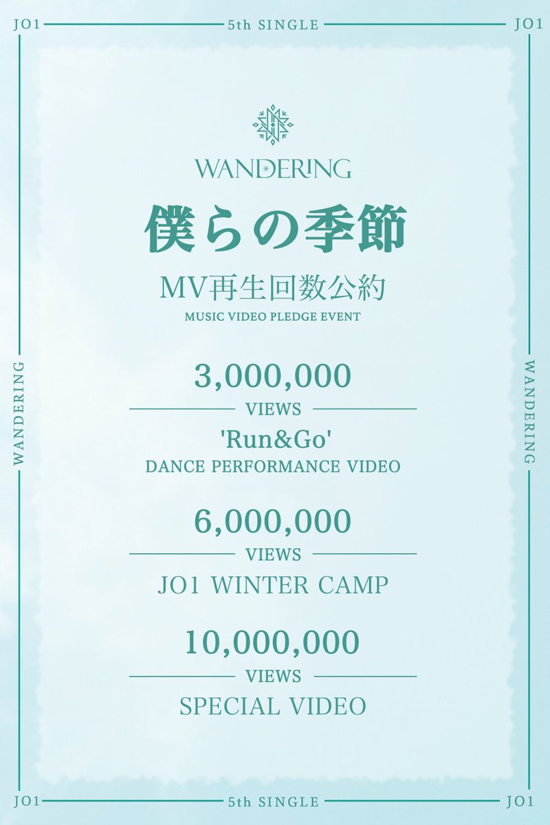 JO1 5TH SINGLE “WANDERING” ‘僕らの季節’ MV YouTube 再生公約︎ 300万回VIEWS: ‘Run&Go’ DANCE PERFORMANCE VIDEO︎ 600万回VIEWS:JO1 WINTER CAMP︎ 1000万回VIEWS:SPECIAL VIDEO#JO1 #WANDERING #僕らの季節 #Prologue JO1JO1 TweetsPrologueWANDERING僕らの季節Related Posts Syoya Twitter Update (260210) – I went to a concert by ZICO, who I really respect!! February 10, 2026 Sukai Instagram Reel with Crystal Kay (260210) – 2/28!! I’ll be taking part in Kay’s birthday concert!! February 10, 2026 JO1 TikTok Update with Sho, Junki, Keigo, Syoya & Mame (260209) – And IIIII!!!! #whitneyhoustonchallenge February 9, 2026